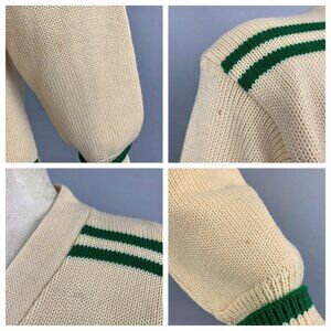 1960s era Englewood Knitting Mills ivory and green wool varsity style cardigan sweater once belonging to Anna with Queen of Peace High School in letters on the back. A handful of tiny spots as shown in last photo but otherwise in excellent condition!
