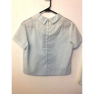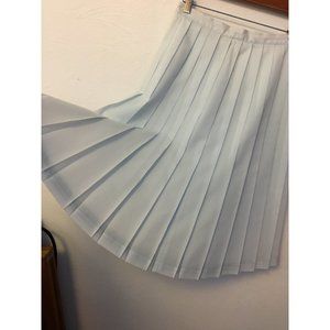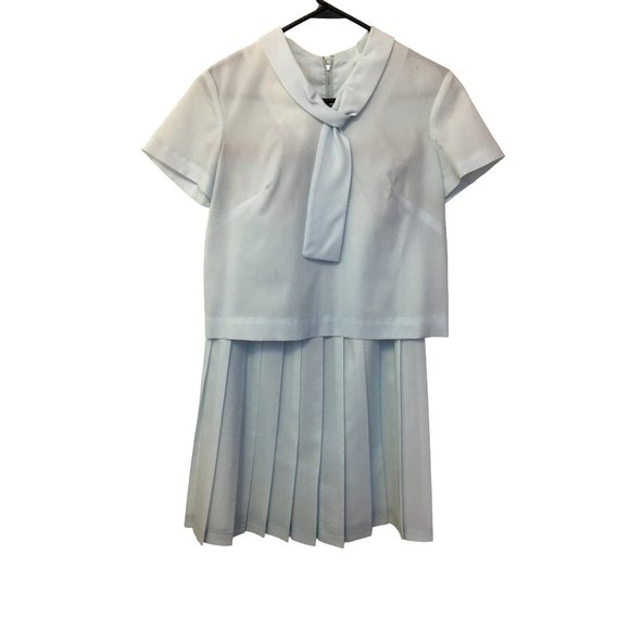 Vintage 1950s two piece skirt set with full pleated skirt and cropped matching top. Pretty light blue baby blue color. Short top has side half bow/ slip bow at collar. Breast darts allow for a nice fit. Back metal zipper. Skirt has lovely pleating with a back metal zip with button. Super cute and just plain darling. Fun for a retro aesthetic or an anime, cosplay, innocent look.