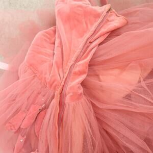Vintage 50s Strapless Coral Pink Tulle Velvet Leaf Applique Formal Prom Dress XS
