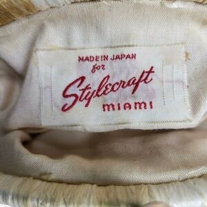 This vintage 1950s Stylecraft Miami handbag is a charming mid-century piece that captures the effortless elegance of the era. It features a woven straw and raffia design in alternating tan and cream tones, giving it a warm, summery look. The bag has a structured, rounded frame with a kiss-lock clasp at the top in polished gold-tone metal, adding a touch of retro glamour.