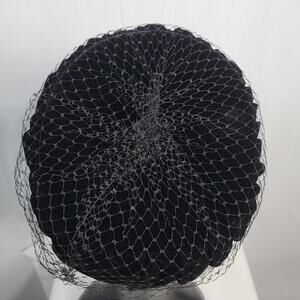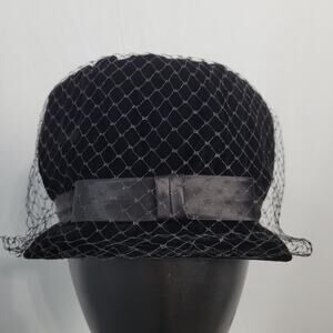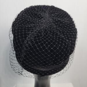 Vintage black hat with mesh and a satin ribbon with bow detail on black. Made in the USA. The hat has a velvet like fabric. The hat and mesh are in excellent condition. It comes it the original box it was purchased in with the original layaway receipt. The box does have wear and staining. This can be seen in the photos.
