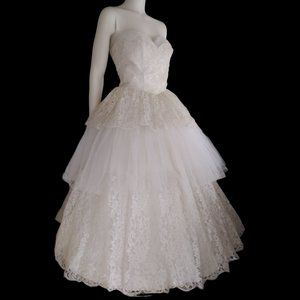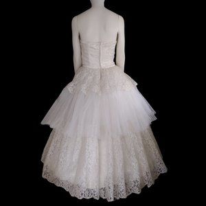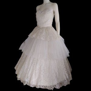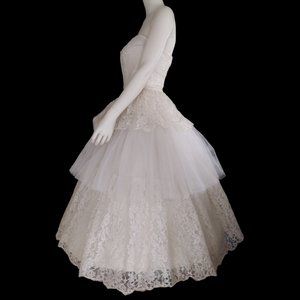 Stunning, vintage 1950s party dress, featuring a strapless, sweetheart neckline. Made from white tulle, and antique cream colored lace fabric, in a tiered design. Super flattering, fit and flare silhouette. The torso is boned, and there is a metal zipper at the back. Fully lined with a thick satin fabric. Comes with the original matching, lace bolero jacket. It has long sleeves and a mock neckline. Button, front and sleeve closures.