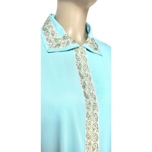 keywords: Vintage, 50s, Designer, nylon, plus size, rare, hard to find, snap front, 3/4 sleeve, peignoir, lingerie, metallic gold, embroidered, collar, house robe, dressing robe, 60s, powder blue, light blue, women's, ladies,