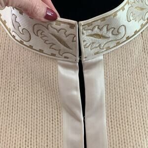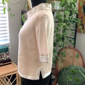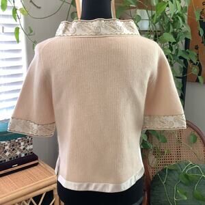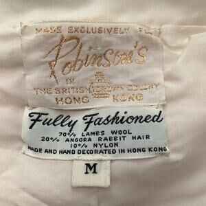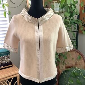 Cream knit with ivory satin trim. Hook and eye closures down front. 3/4 sleeve. Lined. Lambs wool/angora/nylon blend. Vintage size medium - see measurements as vintage sizing differs from modern sizing. Couple marks on inside of lining and an area on front left where the knit has enlarged slightly. In otherwise very nice used vintage condition for its age. Flat lay measurements are approximate.