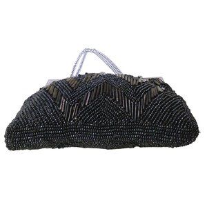 Walborg made in Hong Kong, Logo label, Kiss Lock hinged compartment, 12" drop chain strap, embellished with cut glass Bugle + Seed beads Chevron 'W' pattern embossed textured, on a base Fabric - silk? lined, in neutral dark shades of charcoal black slate with silvertone etched hardware.