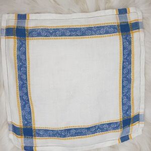 Pre-owned vintage unbranded white square handkerchief with yellow & blue details. No noted flaws. There is no label or tag of any kind present. 14" x 14"