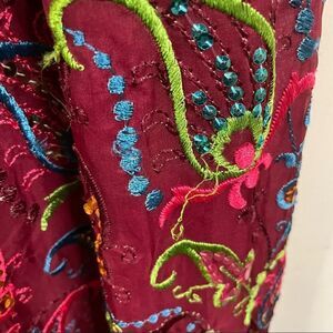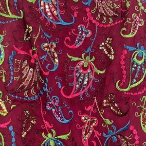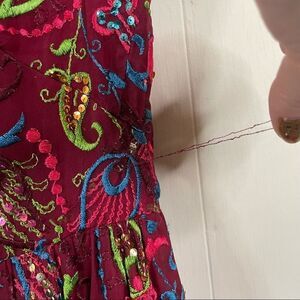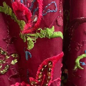 This gorgeous formal vintage dress is in excellent condition. It does have pulled threads throughout the dress, but considering the age, that’s not so bad. Also, they can be repaired. The maroon fabric is embroidered with a brightly colored paisley design and accented with sequins. This is definitely the dress to wear if you want to make a splash at a formal or wedding (just don’t look better than the bride!)