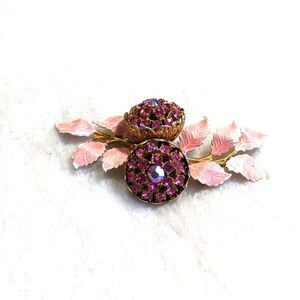 Vintage 50's Pink Dual Flower Rhinestone Brooche with Pink Enameled Leaves