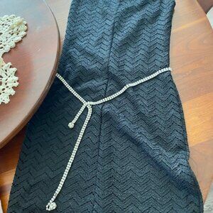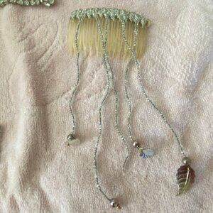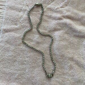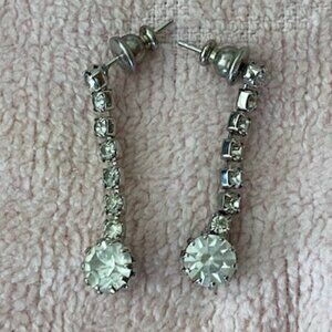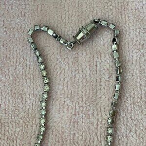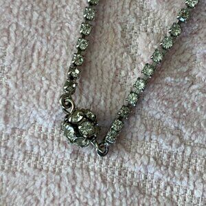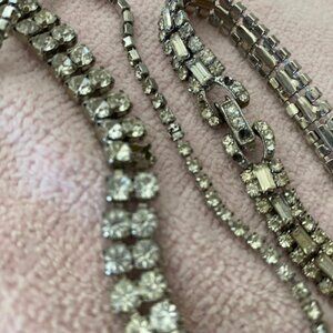 Vintage ('60s) in ART DECO Style ~ ANTIQUED SILVER and RHINESTONE. 5 pieces ... including (1) BELT ~ 2 rows of large rhinestones (3/4" wide) ~ the belt is about 42" long with rhinestone "DISCO BALLS" at both ends. There's a hook part-way up one side that you can put anywhere that's comfortable for you (between 2 rhinestones on the other side (I showed how it would look over a dress & the 2 photos before that show a close-up of it hooked, and then unhooked). I used to wear it loosely hooked over a long black velour jumpsuit.. (2) BRACELET is 6-3/4" long & 3/8" wide. (3) NECKLACE is choker with small DISCO ball, about 13-7/8" long with twist clasp. (4) Pierced EARRINGS are 1" long w/ big rhinestone at bottom & secure back post. (5) HAIR COMB is clear with SILVER fabric across the top and 5 hanging glitter bead strands with a bead and/or metallic feather at the end (one is missing).