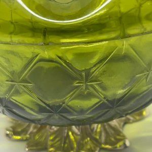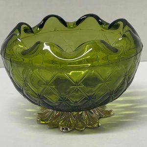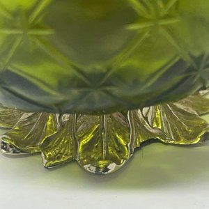 Vintage 6" Indiana Glass Green Duette Quilted Diamond Bowl With Metal Leaf Base