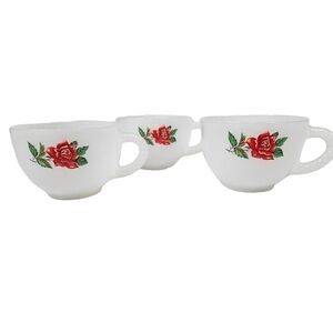 Gorgeous milk glass adorned with delicate red roses. The plate has a indented circle to hold the tea cup in place. The cups have ribbed handles and the bases of the plates have indented checker board patterns. There are no makers marks on the pieces.