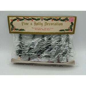 Vintage Package 6 Plastic Snow Cap Timber Evergreen Trees Decorations by Pine & Holly Decoration NIP Made in Hong Kong. They are New in Package, but the plastic does show marks from the Tree Branches, but still Sealed are of the actual items and are part of the Description.