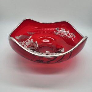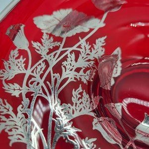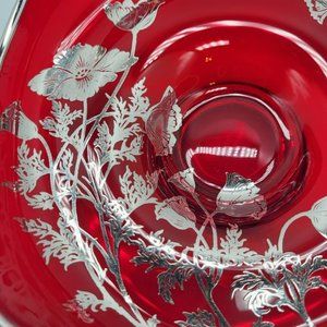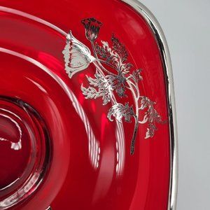 This stunning ruby red dish was made by Silver City in the elegant glass era. It has a non-toxic Flanders silver floral overlay.