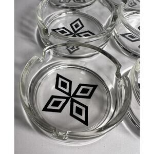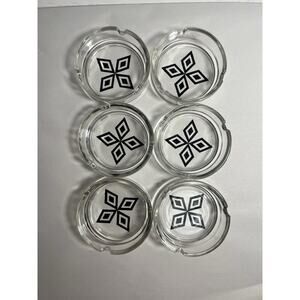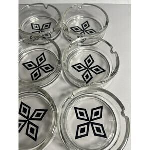 6 set glass ashtray with black design print on bottom stackable with metal holder. EUC