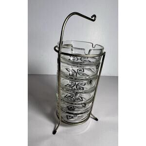 Vintage 6 Set Glass Ashtray Stackable Metal Holder Mid century Bar Ware Decor