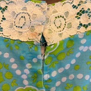 Handmade vintage 60/70’s drop waist dress with lace accents and pleated skirt style bottom. This vintage dress is tagged by Ragstock a well known mid-west company that sells vintage and recycled clothing. Since this is handmade, no size labels to go from so please use measurements provided. It appears to be right around a girls size 12? And knee length. Some staining on lace collar in back as well as on front pleated skirt. The hook and eye closure on neckline is missing the “eye” closures. There is lining at the neck and shoulder area. Measurements are approximately: Armpit to armpit 16” Shoulder to hem 33” Waist 14” Hip 15”