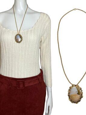 In very good to excellent vintage condition due to what looks like a bit of excess glue on the back of the setting and very minor fading of the gold tone finish only on the back edges of the pendant, both as pictured and not not noticeable when wearing.