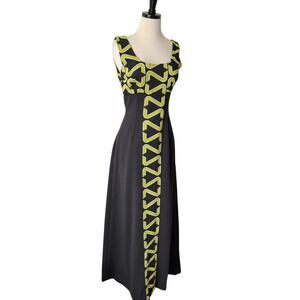 Vintage 60s 70s Black Maxi Dress Yellow Groovy Hippie Disco Empire Waist Mod MCM