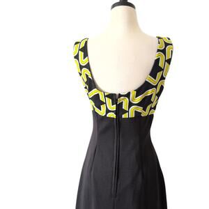 Groovy vintage maxi dress from the 60s or 70s! This retro black dress features a unique yellow funky detail, perfect for a mid-century-modern look. This piece is in excellent, spotless condition for its age!