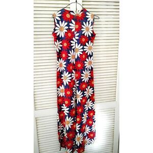 Groovy one-piece jumpsuit in a bold red, white, and yellow daisy print on navy. Sleeveless with a back zipper and wide legs for that classic late 60s, early 70s flower power vibe.