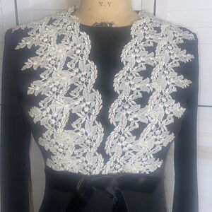 Very unique and a one of a kind. Handmade poly knit black medium weight fabric. Long sleeves. White appliqué trim a