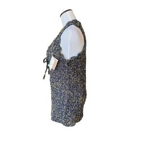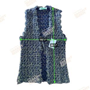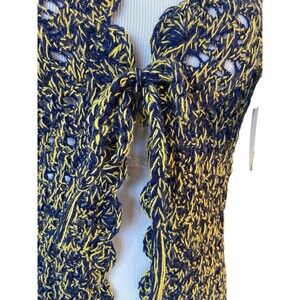 Step back into the retro boho era with this stunning vintage 1970s Helen Sue vest, crafted in Japan and still new with its original tag. The marled navy-and-gold yarn creates a richly textured open-weave look with scalloped edges that feel both handmade and elevated. Ties at the front for an effortless, feminine finish perfect for layering over flowy blouses, maxi dresses, or turtlenecks. A rare piece that channels grannycore warmth, cottagecore romance, and festival-ready flair all in one timeless design.
