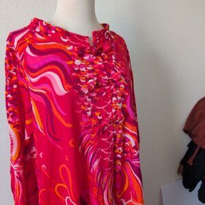 This vibrant piece is a one size item and could fit up to a size 2XL. Best for M, L, XL. Don't miss out on owning a unique piece of fashion history!
