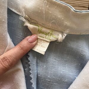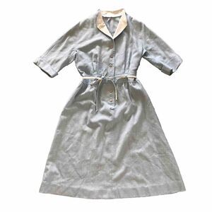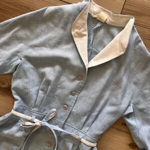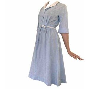 Pale blue dress with contrasting white collar and belt. A-line skirt. thicker, textured fabric. Not sure the material.