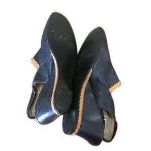 Vintage 60s 70s Navy Blue Pleather Slippers Size 6 1/2 with Tan Braid Trim