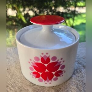 Vintage 60s/70s, mid century, porcelain, red and white sugar bowl with lid.