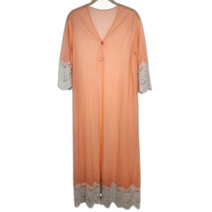 Vintage Lingerie Negligee Robe Duster Bell Sleeve Sheer Lace Coral Peach Pink Rose Flower Snap Closure MCM