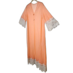 Vintage 60s 70s Robe Duster Flowy Glam BOHO Bell Sleeve Sheer Lace Coral Peach S