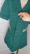 Aileen waitress smock in Kelly gree polyester with dark red and white varsity style stripes on waist. It is short sleeved with a rolled arm hem and features a classic wide dagger collar. The front is a four button closure and has two patch pockets for notepads, straws, menus...