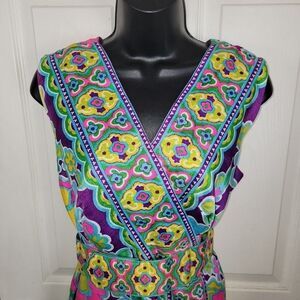 Psychedelic bright floral maxi dress. It has a bold floral print in purple green yellow and blue. Sleeveless, wrap style skirt, zips up back, snap belt, no fabric content tag.