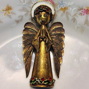 This vintage 60s ART Arthur Pepper Praying Angel Brooch is a signed piece featuring a Christmas holly design. Made of enamel on an antique gold tone metal base, this 2.25 inch brooch is a unique addition to any woman's jewelry collection. With its red, green, and white color scheme, this piece captures the essence of the Christfmas season while also embodying a classic vintage aesthetic. Perfect for adding a touch of retro charm to any outfit, this brooch is a timeless treasure from the United States, dating back to the 1960s. Vintage very good condition.