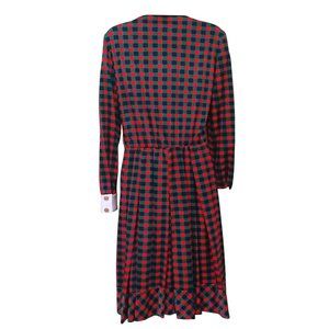 Vintage 50s-60s-70s Dress, Anjac Fashions of California Styled by Jack Needleman made in USA, A-Line Shirtwaist Sheath Circle, Ladies -Medium (8/10), Full 20" Zipper front, pleated circle skirt, elastic waist, big pointed daggar collar, double logo buttons cuff long sleeves, checked squares 3-tone pattern, easy care hand wash unknown double-knit polyester? nylon? fabric, structured semi-fitted, soft shiny lightweight in bright bold shades of red teal navy. In pre-owned* condition with no outwardly visible flaws and general wear to include: dingy collar, no Belt -see pics for details. Runway On Trend Chic Classic Mod Retro Evening Party Cocktails Entertaining Hostess Career Casual Urban Street Statement