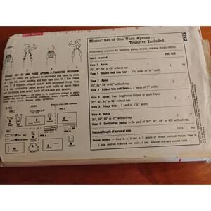 Misses set of one yard aprons. Transfer included. All views are gathered to waistband and have tie end. View 1 has bib, patch pockets and bias tape trim. View 2 has ribbon trim. View 3 features shaped pocket with purchased fringe trim. View 4 has constasting patch pocket with ruffle of apron fabric and Christmas tree detail made of rick-rack and sequins.