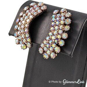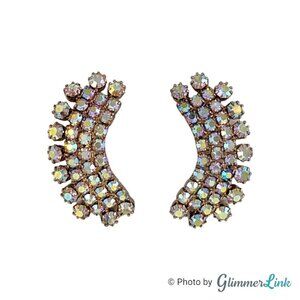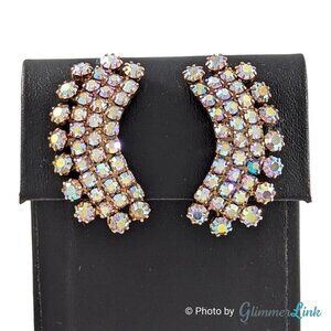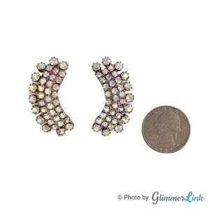 Vintage 60s Aurora Borealis AB Crescent Ear Climber Gold Tone Clip On Earrings