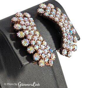 Vintage 1960s gold tone ear climber clip on earrings featuring four rows of aurora borealis AB rhinestones.
