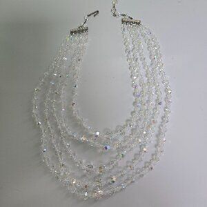 Elegant vintage 1960s necklace featuring five strands of Austrian Crystal Aurora Borealis beads with matching clip earrings. Adjustable length for perfect fit. A stunning piece embodying quiet luxury. Picture doesn't do it justice, extremely sparkly.