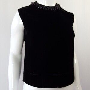 Vintage 60's Baar & Beards black velvet crew-neck tank top. Has beading around neckline, and single hook/full metal zipper closure in back. Union made.