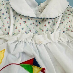 Adorable 1960s baby girl top - tag marked size 18 months. Apron style with a peter pan collar and the sweetest embroidered little girl with a sun bonnet and kite. The flowers are red and blue with greenery. In good condition condition with some light spots on the front ruffle (not super noticeable) and some on the front collar. These may be able to be removed.