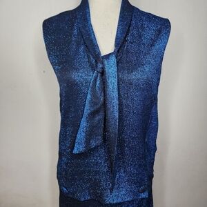 Metallic blue sleeveless top with tie at neck with side zipper.