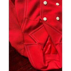Blue international ladies garment workers union tag confirms this classic cherry red lightweight double breasted jacket with round white buttons