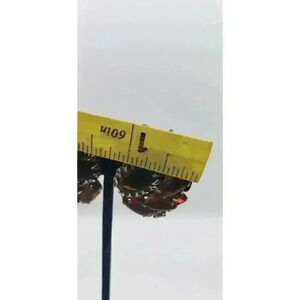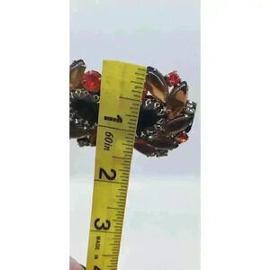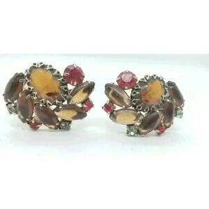 Each earring features a gold tone metal base and all prong setting. The rhinestones are in light green, red, orange and rich golden brown colors. The largest oval cut brown rhinestone is set in an open center ornate prong mount, with an open backside. All of the topaz/brown marquis glass cabochons also have open backsides, creating the glowing color. The gold metal clip back fixtures are working properly with secure hold when worn. The backs of the earrings show the cupcake gold metal settings, as well as the long gold metal stabilizing bar up the center. There are no signatures on any of the pieces. This vintage jewelry set is very well made and in very good condition.