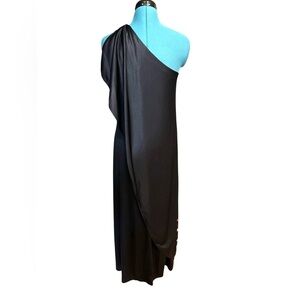 This vintage 60's Black Abstract Scarf One Shoulder Dress by Theme is a stylish and unique piece perfect for a party occasion. The dress features a one shoulder maxi style with an art deco look, made of polyester material from the United States. The size small dress is an original from the 1960s, making it a must-have for vintage fashion enthusiasts looking to add a touch of retro glam to their wardrobe.