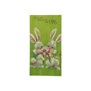 Set of 4 super cute kitschy greeting card from Sangamon from the 1960's features a pair of bunny rabbits holding flowers on the front that says "I'm All Ears".