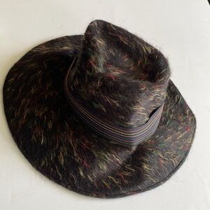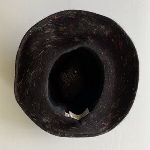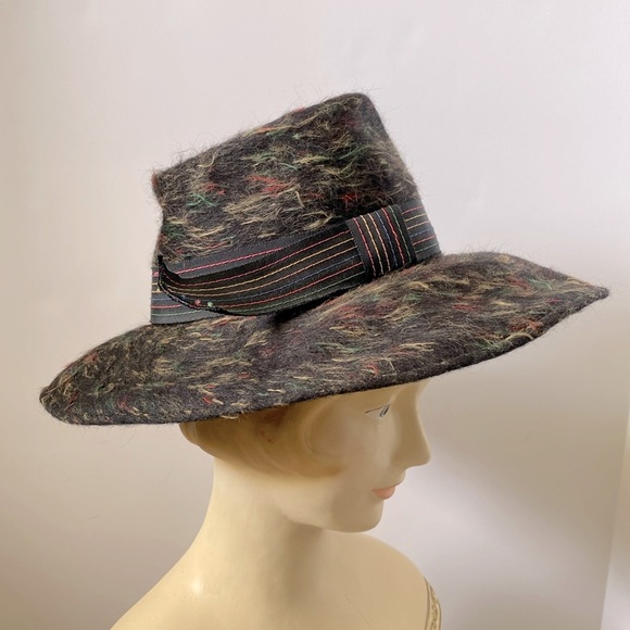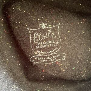 True vintage 1960's Sears Millinery hat. Black with streaks of red, green, and gold. Stamped Etoile Melange Blend Felt. 70% Wool 30% Felt. The grosgrain ribbon trim has a cute rainbow stitch design. There is also a union label, but the Sears label is attached overtop it and it is hard to read.