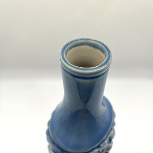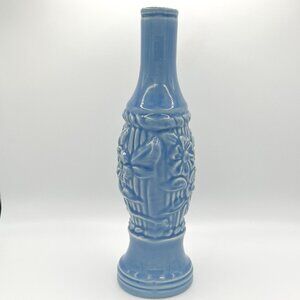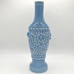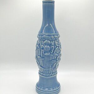 This vibrant sky blue glazed ceramic bottle features raised floral and bird detailing in classic folk-art style. The high-gloss finish and textured pattern give it a bold retro feel perfect for collectors of Beam bottles, vintage barware, or MCM decor.