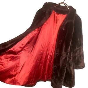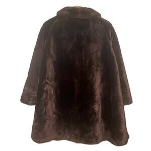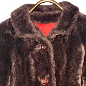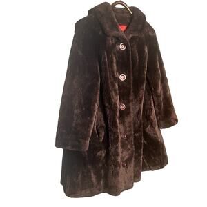 Vintage 60s Brown Faux Fur Swing Coat Button Front Collared Pockets Rockabilly